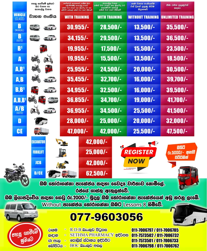 Prices for driver's licenses in our company අප ආයතනයේ රියදුරු බලපත්ර සඳහා මිල ගනන් Important | වැදගත් අප හා ලියාපදිංචි වීමට රුපියල් (RS -1000) පමණ මුදලක් අවශ්ය වන අතර ලියාපදිංචියෙන් පසුව ඉතිරි මුදල වාරික වශයෙන් ගෙවීමට හැකිය. ලයිසන් එක සඳහා online ලියාපදිංචිය ආරම්භ කිරීමට පහත APPLY NOW බටන් එක ක්ලික් කරන්න Click the APPLY NOW button below to start online registration for the license APPLY NOW